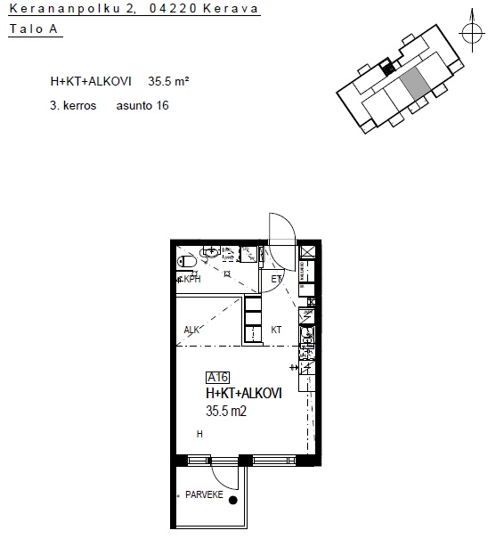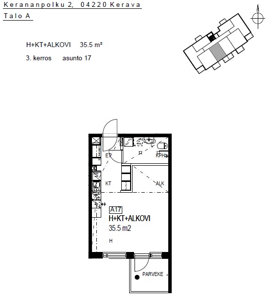 | 1 H + KT + ALKOVI | 35.5 m² | 665 €/kk |